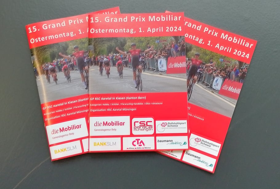 Unser Ostermontag-Radrennen rückt immer näher. Nun steht auch das Programmheft in gedruckter Form zur Verfügung. Die Vorfreude auf unser Rennen steigt. Ein grosses Dankeschön allen Inseraten und Gönner. Im Programmheft findet man alles wichtige zum 15. Grand Prix Mobiliar. Schaue es dir doch einfach an.